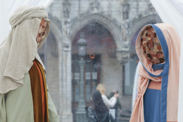 As faces das figuras do presépio eram cobertas por retalhos de tecido, sem olhos, bocas ou narizes. A artista Victoria-Maria Geyer disse ao The Brussels Times que as peças foram criadas “deliberadamente sem traços faciais para que qualquer pessoa possa se ver nelas” e para refletir a herança têxtil da região.