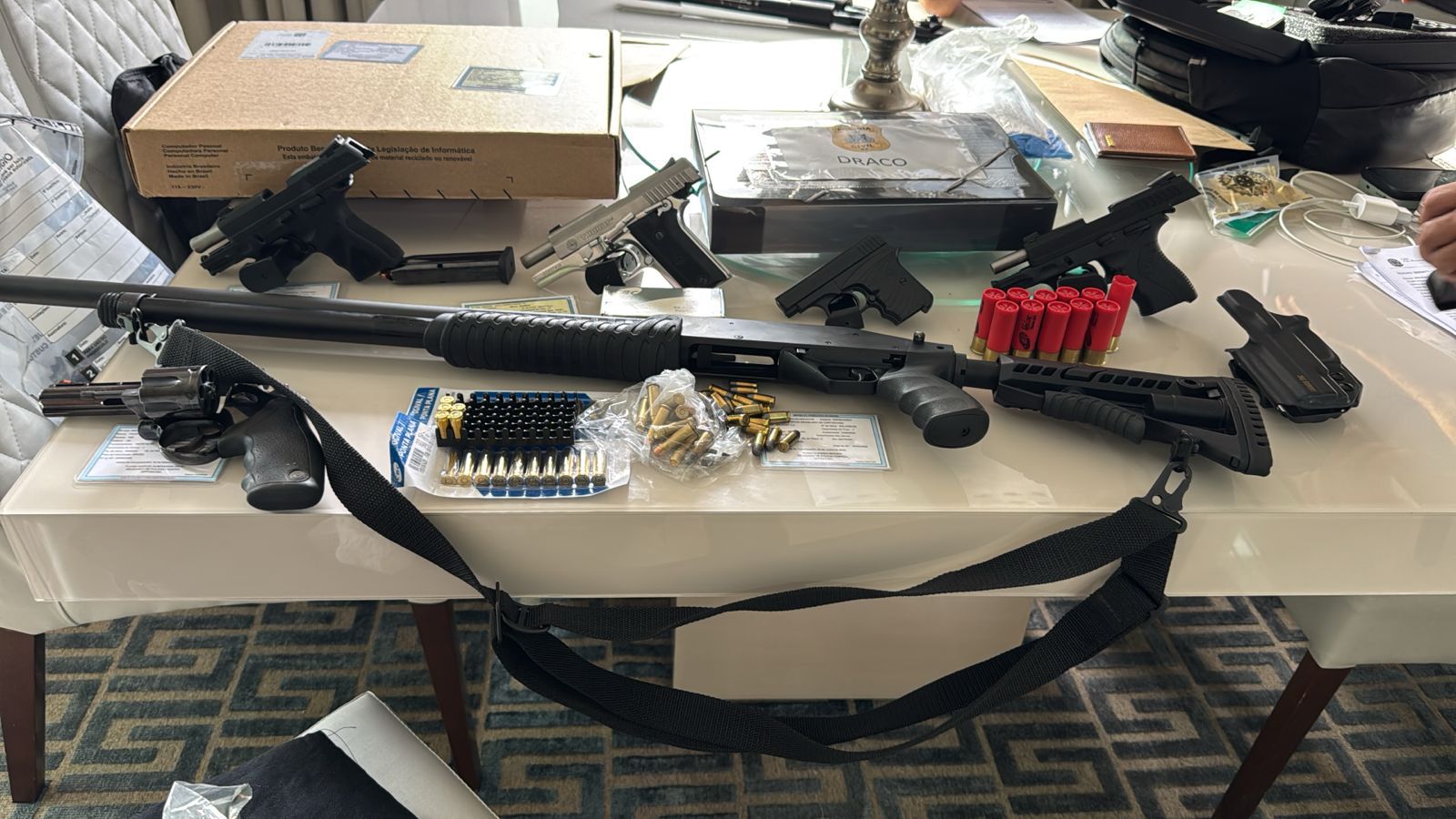 Os levantamentos também indicam que o grupo se dedicava ao comércio ilegal de armas de fogo, incluindo armamentos de calibre restrito. O material apreendido ao longo das diligências inclui centenas de armas, entre elas fuzis, pistolas, revólveres, rifles e modelos de calibre 12, além de grande quantidade de munições e R$ 200 mil em espécie. O volume encontrado reforça a logística sofisticada e a ampla capacidade de distribuição da organização criminosa.