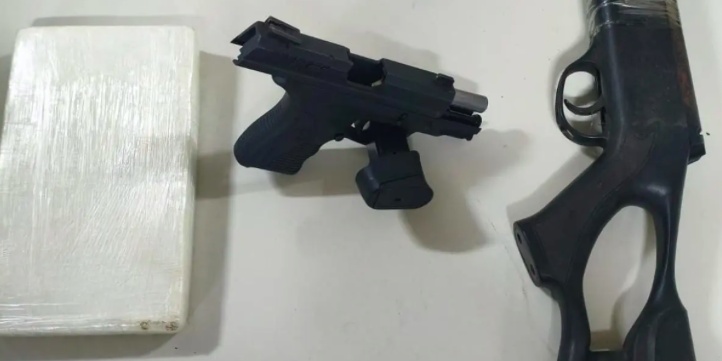 Com o suspeito detido, foram apreendidos uma pistola calibre .380, munições, uma espingarda de pressão calibre 5,5 mm e um tablete de cocaína.