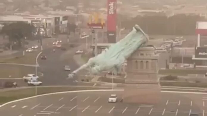 Durante o temporal que atingiu Guaíba, na Região Metropolitana de Porto Alegre, nesta segunda-feira, 15 de dezembro de 2025, uma réplica da Estátua da Liberdade instalada na loja Havan caiu. Imagens do momento foram compartilhadas nas redes sociais. A Defesa Civil informou ventos superiores a 90 km/h na região, com previsão de novas tempestades, mas não houve feridos.