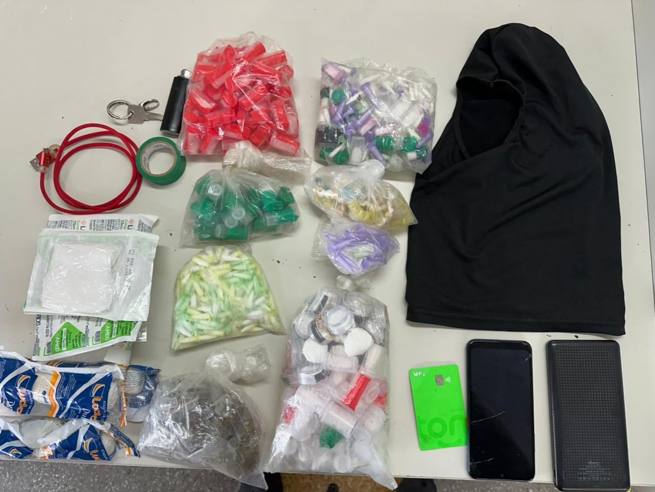 Durante a busca pessoal, foram encontrados com ele 647 pinos de cocaína, 33 porções de maconha e 98 pedras de crack, além de um celular e uma balaclava.