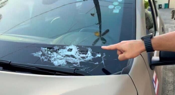 Veículos na região ficaram danificados. Um Peugeot teve para-brisas dianteiro e traseiro estilhaçados, e a viatura da PM com prefixo 8.3017 sofreu danos no motor e no vidro frontal.