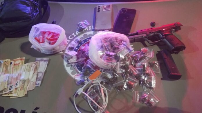 Entre os itens apreendidos estavam: pistola calibre 9mm com 15 munições, um carregador, 70 porções de maconha, 30 pinos de cocaína, dois celulares e R$ 558 em espécie.