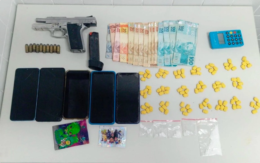 Entre os itens apreendidos estavam uma pistola calibre .40, carregadores e munições intactas. A revista também revelou uma estrutura de comercialização de entorpecentes, incluindo comprimidos de ecstasy, porções de cocaína, dinheiro em espécie e uma máquina de cartão utilizada para facilitar pagamentos ilícitos.