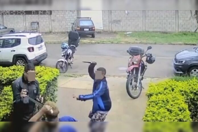 Motoboy é assaltado na tarde desta segunda-feira (5/1) em Santa Maria, no Distrito Federal, enquanto se preparava para uma entrega. O vídeo que circula mostra a vítima descendo da moto, pegando a mercadoria e se aproximando do prédio onde faria a entrega, quando aparecem dois homens armados com facas e avançam contra ele.