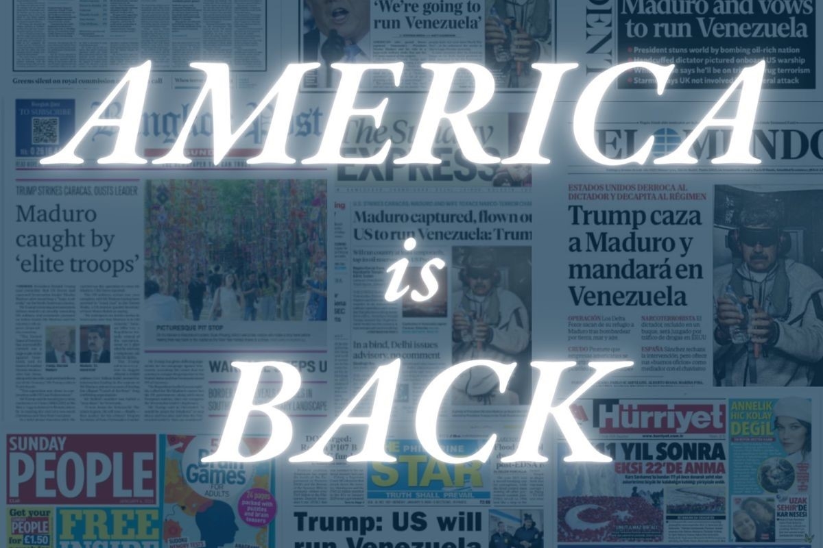 O texto acompanha ainda uma imagem de capa que reúne manchetes de jornais de vários países sobre a prisão de Maduro, com a frase em destaque “America is back”.