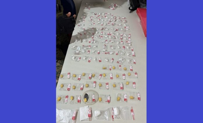 Na abordagem, foram encontrados: 04 papelotes de cocaína, 90 pinos de cocaína, 22 comprimidos de ecstasy (cor amarela) e 02 aparelhos celulares.