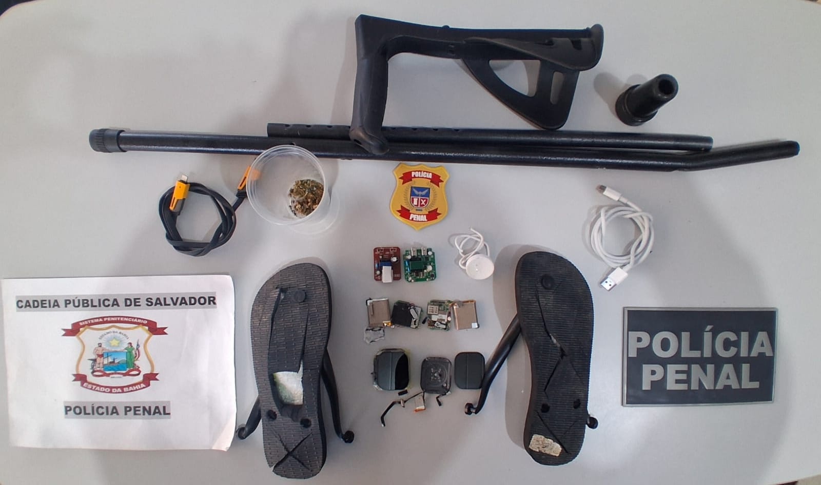 No intuito de burlar a fiscalização, a visitante escondeu o material ilícito dentro de uma muleta e no par de sandálias. A farsa foi descoberta assim que a mulher passou pelo equipamento; as imagens apontaram os itens ilícitos.