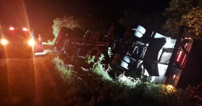 Três homens ficaram feridos após o tombamento de uma carreta carregada de frutas no início da madrugada desta sexta-feira (09), na BR-324, nas imediações do Povoado Santana, em Riachão do Jacuípe, no trecho que segue em direção a Tanquinho, na região da Bacia do Jacuípe.