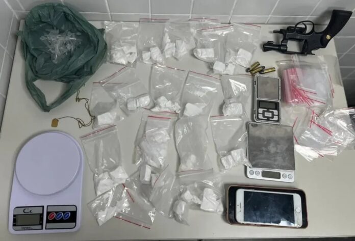 Durante a ação, foi apreendido com um dos homens um revólver calibre .38, carregado com 3 munições. Com o segundo suspeito, a PM encontrou 29 embalagens de substância análoga à cocaína, 3 balanças de precisão, 3 celulares e embalagens usadas para acondicionar entorpecentes.