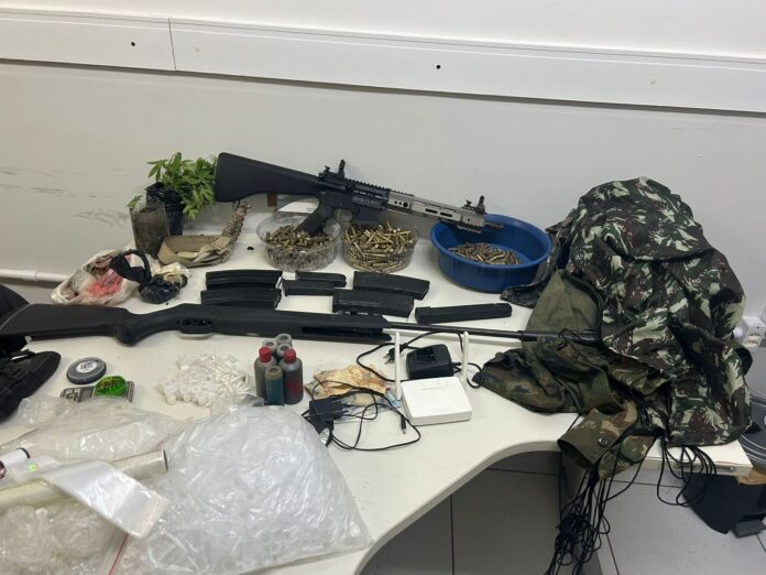 Durante as buscas, foram apreendidos um fuzil cal. 556, 326 munições cal .40, 207 munições cal .556, 187 munições cal 9mm, uma espingarda de pressão, dois carregadores cal .40, quatro carregadores de fuzil, três roupas camufladas, uma rede camuflada, R$ 122,00 em espécie, 100 g de crack, 100 g de haxixe, 84 pinos de cocaína, cinco pacotes de pólvora, uma balança, sacolas com pinos vazios, uma lanterna, carregador de HT, 1 um coldre, duas mudas de cannabis, um veículo Spin com restrição furto/roubo e duas motos sem identificação.