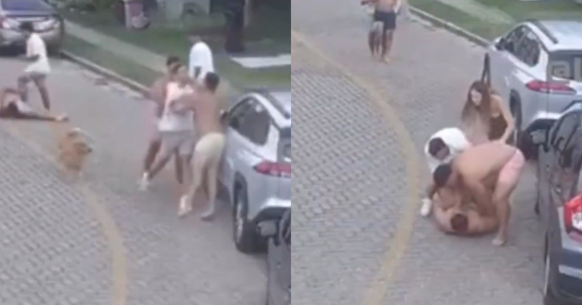 A briga evoluiu para agressões físicas, com socos, empurrões e o uso de objetos, incluindo uma cadeira de plástico. O cachorro participou da movimentação, tentando subir nas pessoas durante o tumulto.