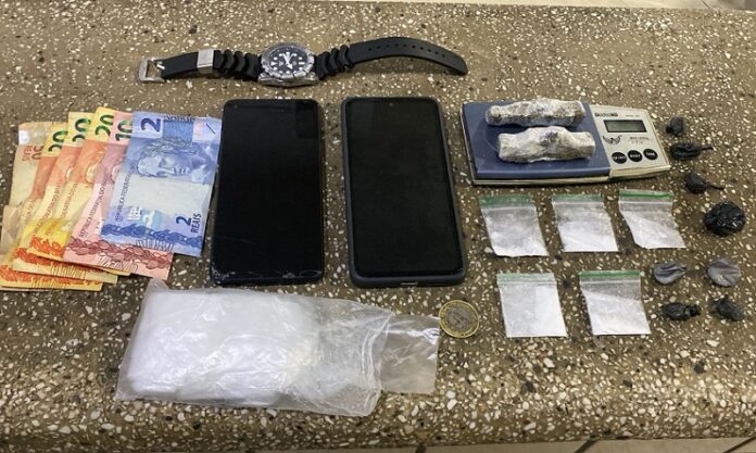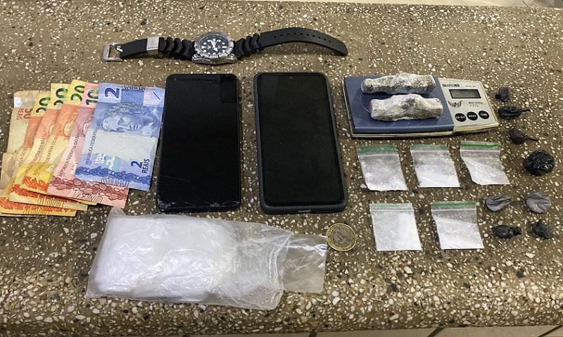 Com eles foram apreendidos: 13 porções de cocaína; 2 porções de maconha; embalagens para acondicionamento de drogas; 1 balança de precisão; 2 aparelhos celulares; 1 relógio; e R$ 123,00 em espécie.
