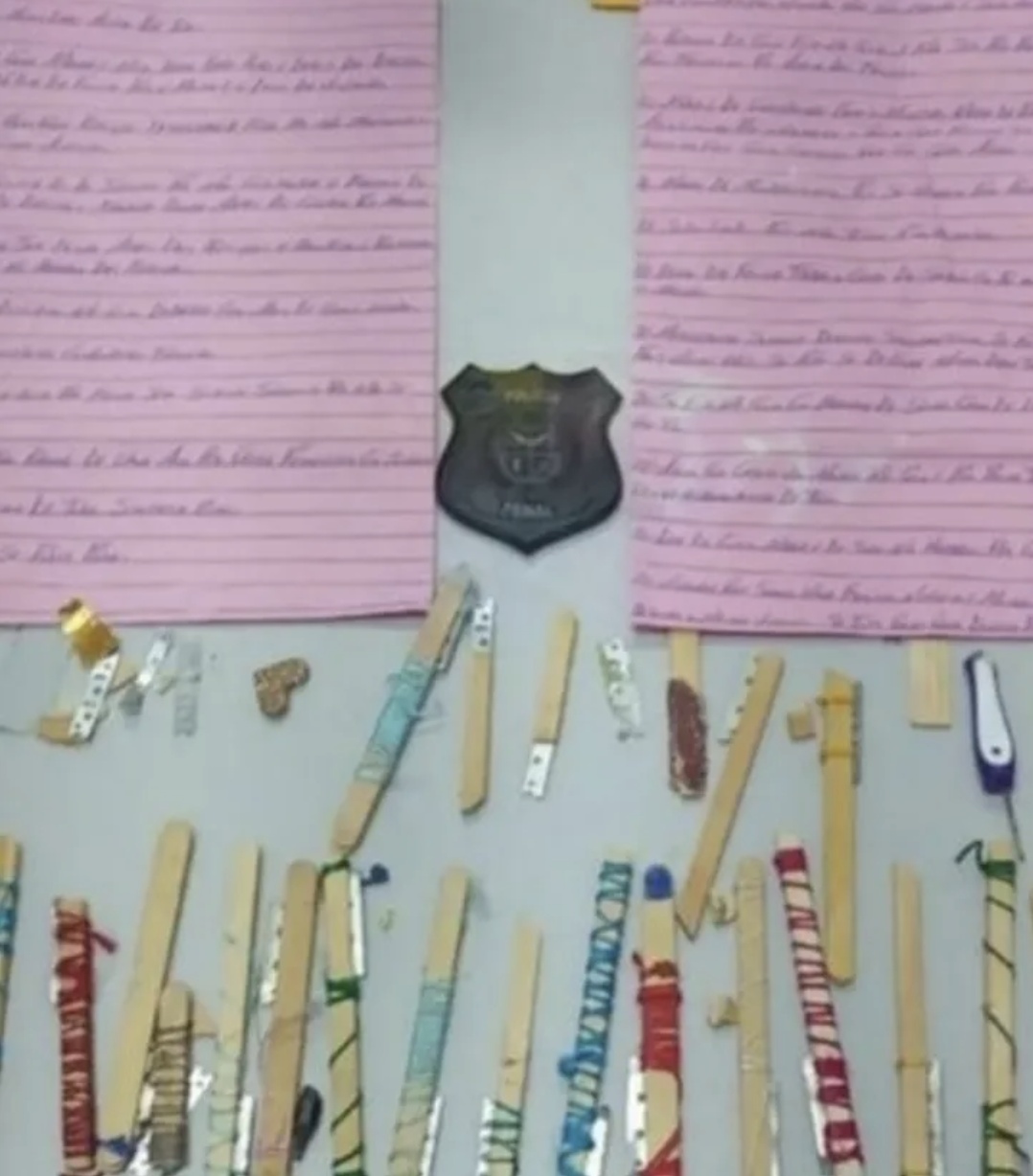 Além do manuscrito, a operação apreendeu cerca de 30 objetos considerados potenciais armas brancas, como lâminas improvisadas e pedaços de madeira. Todo o material foi catalogado e ficará à disposição das autoridades para investigações.