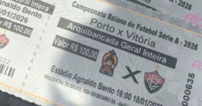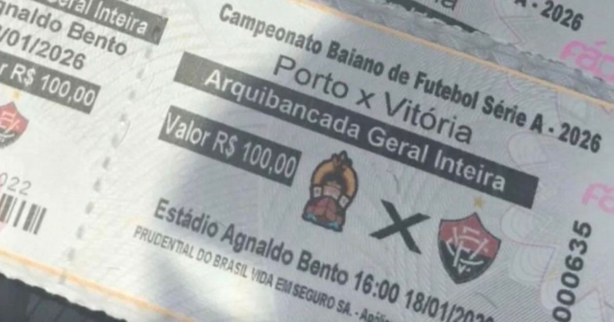 Para o confronto, o Porto definiu ingressos em R$ 100,00 (inteira) e R$ 50,00 (meia). A meia-entrada vale para todos os públicos obrigatórios por lei e também para funcionários públicos municipais, estaduais e federais. Segundo o presidente André Santos, cerca de 30% da arrecadação ficou com custos operacionais, segurança, staffs, bombeiros civis e infraestrutura, sobrando menos de 45% para o clube. A renda bruta foi de R$ 73.000,00 e a líquida, R$ 31.000,00. O duelo terminou com vitória do Vitória? Não — Porto e Vitória ficaram no 1 a 1 pela terceira rodada do Baianão 2026.