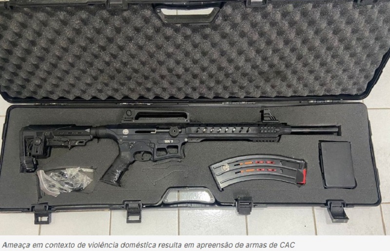 Durante o cumprimento da ordem, o Judiciário autorizou mandado de busca e apreensão. Na residência, os policiais encontraram um revólver calibre .357 e uma espingarda semiautomática calibre 12. A Polícia Civil informou que o investigado é CAC — Colecionador, Atirador Desportivo e Caçador — categoria que permite a posse legal de armas, desde que atendidos os requisitos legais, mas não impede a apuração criminal quando há indícios de ameaça ou violência doméstica.