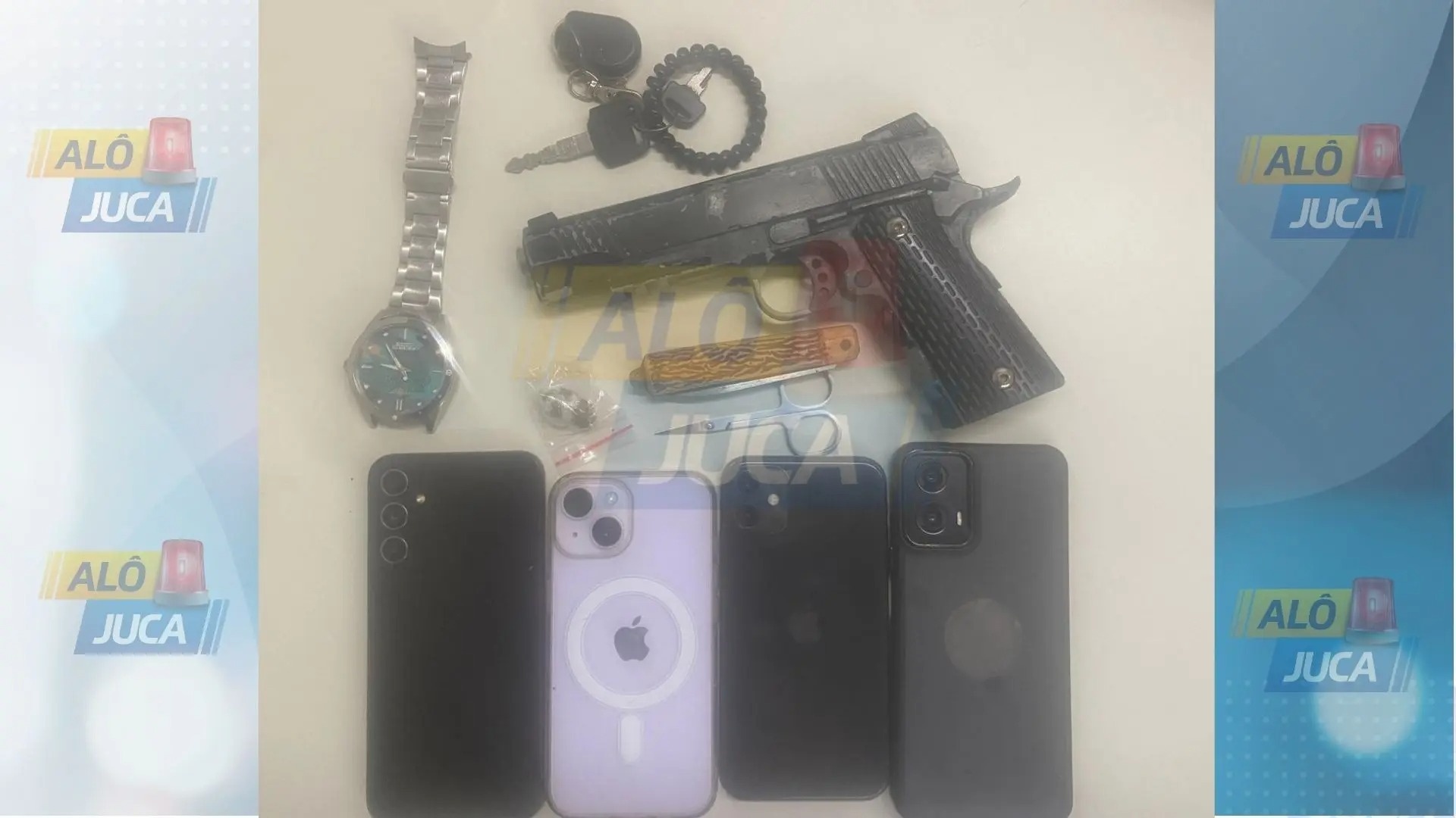 Segundo informações do Alô Juca, a ação também resultou na recuperação de aparelhos celulares e outros objetos roubados. Durante a abordagem, foram apreendidos quatro celulares, um relógio, maconha, um simulacro de pistola e a motocicleta usada nos crimes, com três vítimas reconhecendo os criminosos.