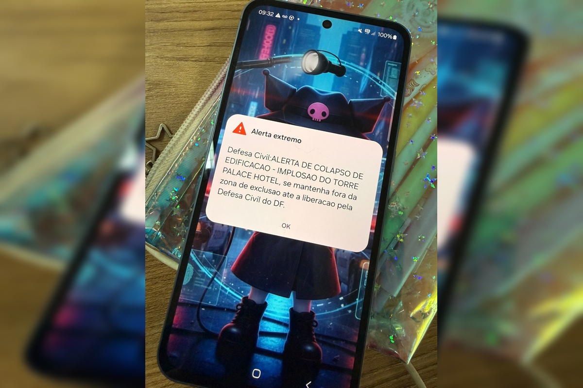 A Defesa Civil do Distrito Federal enviou um alerta sonoro em celulares sobre a implosão do hotel Torre Palace, neste domingo (24/1). A mensagem foi disparada diretamente para os celulares localizados na área de risco às 9h34.
