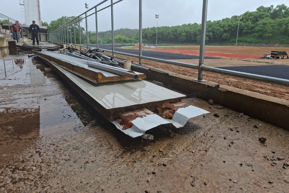 Materiais de construção ficaram expostos à chuva, com lâminas de vidro que custam, em média, R$ 700 por metro quadrado. A área interna, onde ficam os vestiários, abriga morcegos. A estrutura improvisada com refeitório e banheiros para trabalhadores ainda fica ao lado da pista, com um calendário de cronograma sem marcações a partir de abril de 2025.