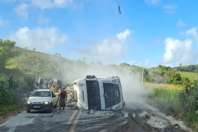 Carreta com carga de cimento tomba e bloqueia trecho da BR-101 em Itabela
