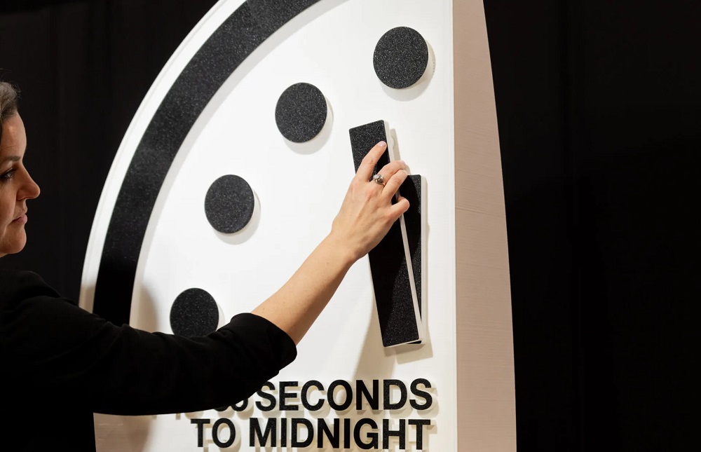 O Relógio do Juízo Final chegou a 85 segundos para a meia-noite, a menor marca já registrada em 80 anos, segundo o Boletim de Cientistas Atômicos divulgado nesta terça (27). Criado em 1945 por cientistas como Einstein e Oppenheimer, o relógio é uma representação simbólica do fim da humanidade, especialmente em cenário de guerra nuclear. Conflitos globais em ascensão — Paquistão contra Índia, Rússia contra Ucrânia —, além de tensões envolvendo Israel e os EUA contra o Irã, elevam o risco nuclear mundial.