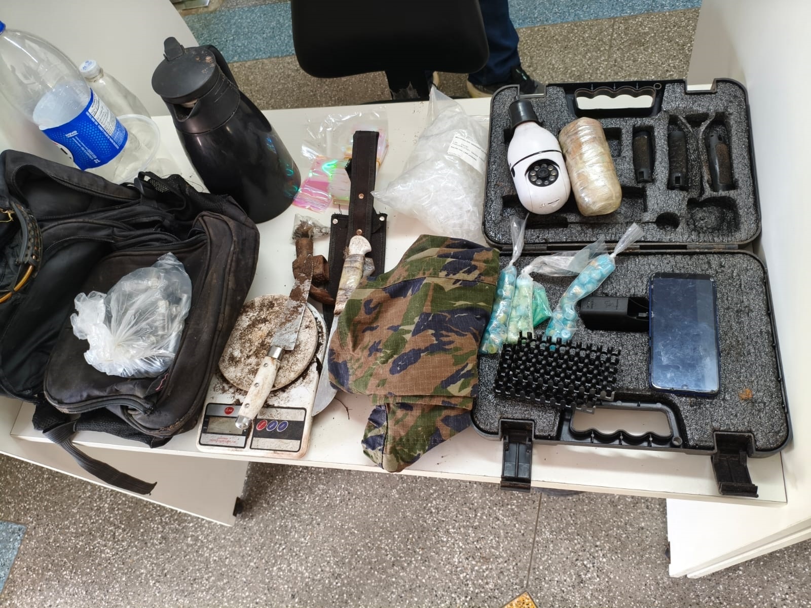 No local, foram apreendidas três porções de pedras de crack, facas, uma balança de precisão e uma câmera de monitoramento instalada irregularmente. Após a operação, o material recolhido foi encaminhado à Delegacia da área.
