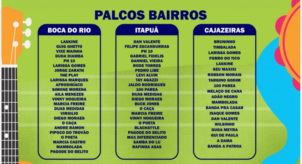 Entre as atrações anunciadas estão Nelson Rufino, Batifun (com Fernando Rufino), Mariene de Castro, Márcio Victor, Malê, Ganhadeiras de Itapuã, Roberto Mendes, Edil Pacheco, Taian Riachão, Gal do Beco, Juliana Ribeiro e Ju Moraes.