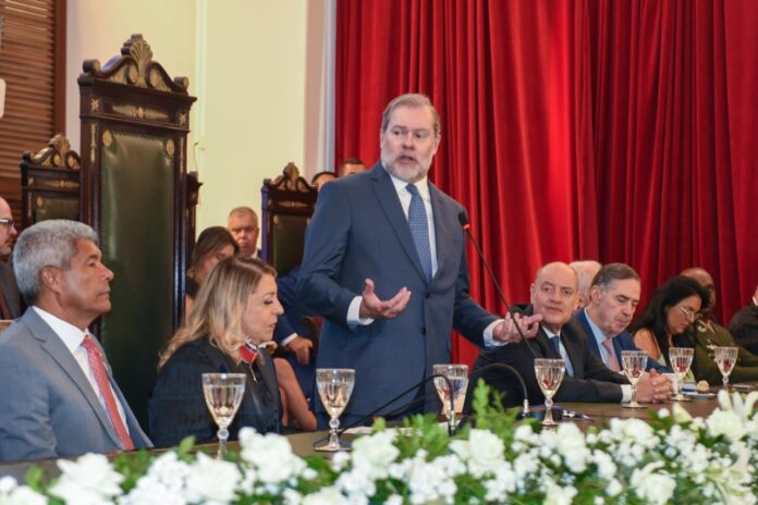 O ministro Dias Toffoli, do Supremo Tribunal Federal (STF), participou nesta quinta-feira da solenidade de posse do desembargador José Rotondano como presidente do Tribunal de Justiça da Bahia (TJ-BA) para o biênio 2026-2028. O ato foi realizado pela manhã no Salão Nobre do Fórum Ruy Barbosa.