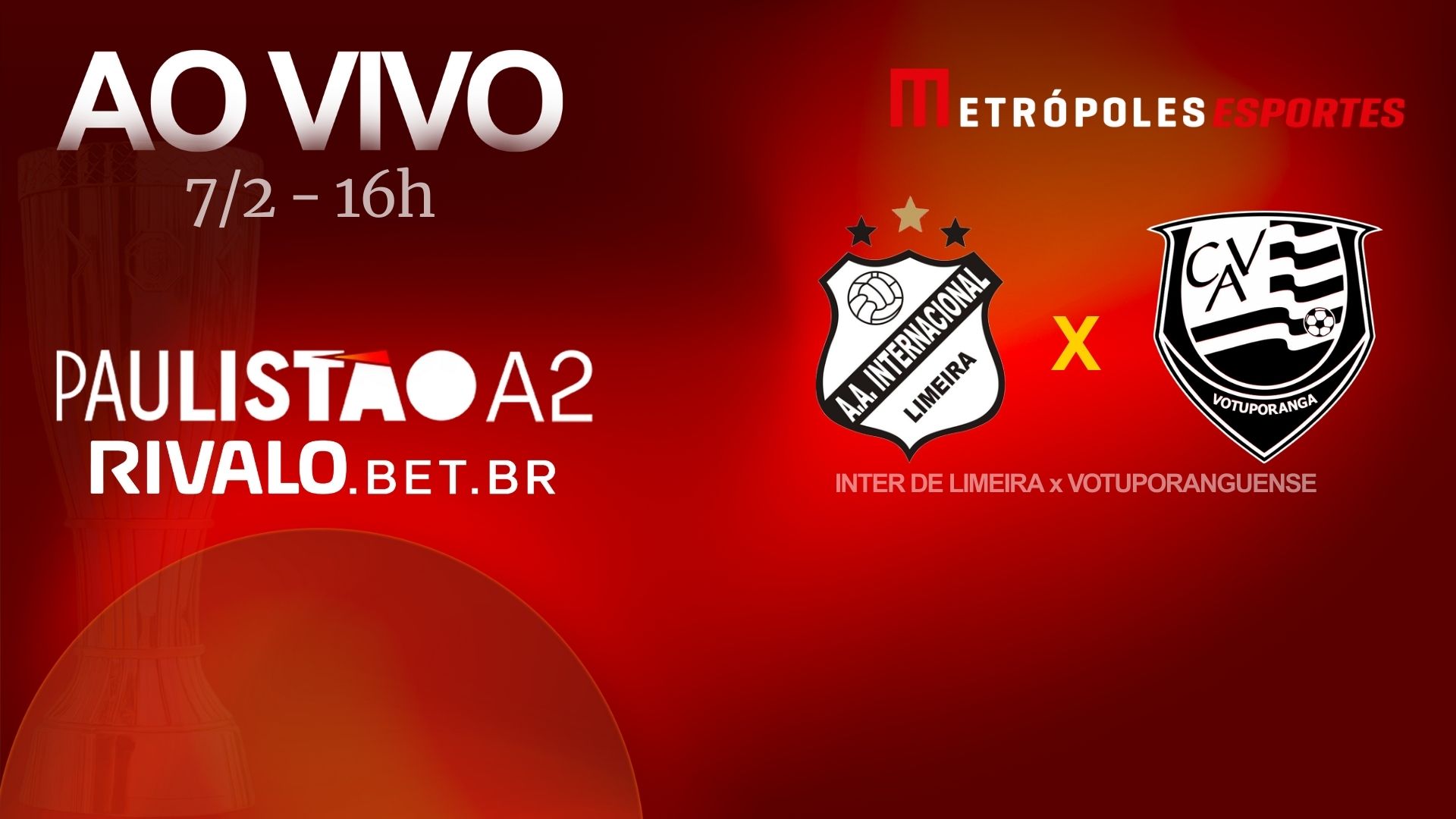 Meta descrição: Transmissão ao vivo da partida Inter de Limeira x Votuporanguense pelo Paulistão Série A2 Rivalo 2026, com direitos do Metrópoles Esportes, via YouTube, em Limeira, SP.