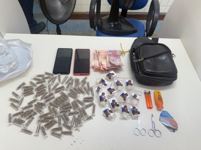 Durante a abordagem, uma mulher que acompanhava o grupo tentou se desfazer de uma pochete. Os policiais encontraram 98 porções de maconha, 13 porções de cocaína, dois celulares e dinheiro em espécie.