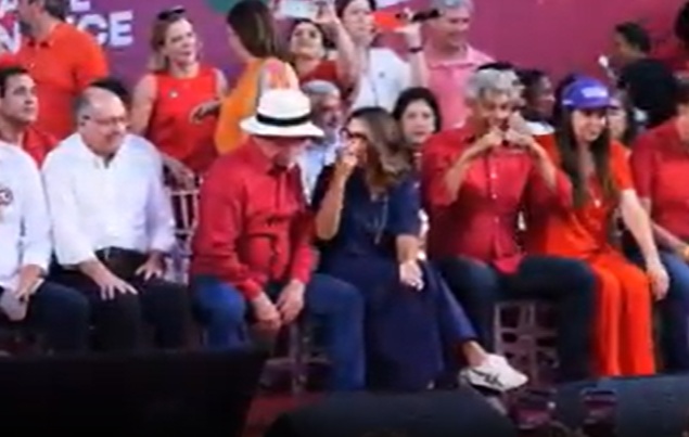 No vídeo, Janja observa a aproximação de uma mulher ao palanque, identifica Manuella Tyler e gesticula para Lula após a visitante deixar o palanque.