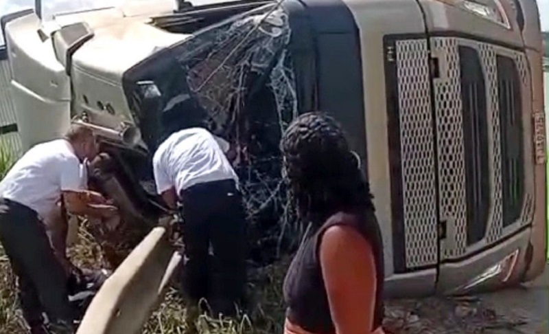 Uma carreta que transportava cerca de 60 bovinos tombou na tarde de quarta-feira (11) na BR-101, a aproximadamente 18 quilômetros de Eunápolis, em uma curva nas imediações do distrito de Mundo Novo.