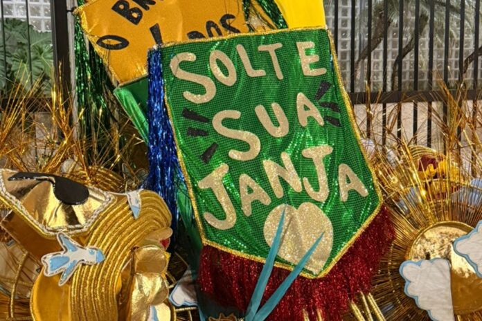 A ala de roupas inspira-se em blocos de rua da esquerda, com mensagens políticas progressistas e ironia. Em estandartes, a frase “Solte sua Janja” surge como exemplo da essência brincalhona do país, capaz de ironizar até a primeira-dama.