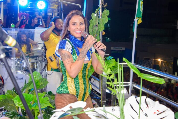 Não foi apenas BaianaSystem. O Bloco O Vale, puxado pela cantora Alinne Rosa, entoou o coro “olá, olá, olá, Lula, Lula” na noite deste sábado (14). A apresentação destacou o tema “Só Tem no Brasil”, com a artista atravessando a avenida vestida de verde e amarelo.