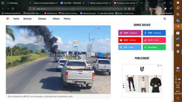 O trecho próximo ao Posto Serral, na BR-10, em Itamaraju, voltou a ser bloqueado por produtores rurais na manhã desta quarta-feira (18). A interdição ocorreu sem aviso prévio, surpreendendo a Polícia Rodoviária Federal.