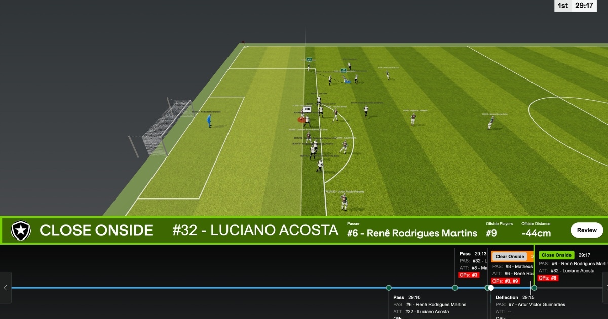 As imagens geradas pelo SAOT incluíram jogadas classificadas como de alta complexidade. Em um dos registros, o lateral Renê, em ação ofensiva do Fluminense, aparece com o pé direito projetado à frente da linha defensiva formada por Alex Telles, indicando posição irregular.