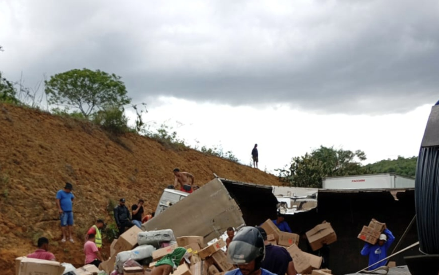 Uma carga de produtos da Shopee foi parcialmente saqueada por populares após um acidente envolvendo uma carreta na BR-116, no fim da tarde desta sexta-feira (20), no trecho do município de Brejões, no Vale do Jiquiriçá.