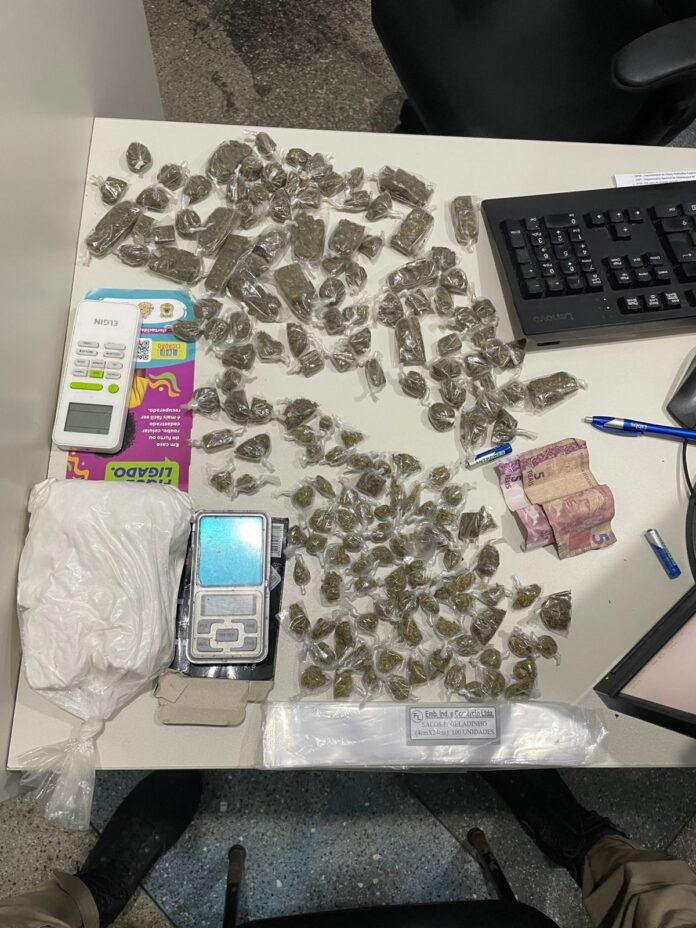 Durante as buscas na região, os policiais encontraram 161 porções de maconha, uma porção de cocaína, uma balança de precisão e R$ 15 em espécie.