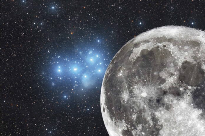 A uma distância de 444 anos-luz da Terra, o aglomerado estelar aberto conhecido como Plêiades, também chamado de Messier 45 (M45) ou “As Sete Irmãs”, é um dos objetos mais marcantes do céu profundo. Nos primeiros minutos desta terça-feira (24), ele ficará bem próximo à Lua, aos olhos desarmados.