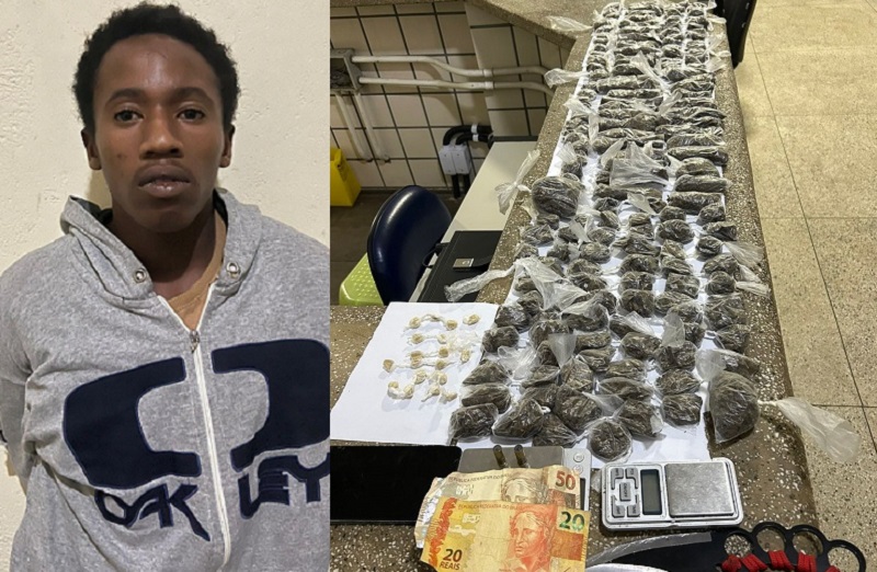 Medeiros Neto registrou a prisão em flagrante de um jovem de 19 anos, que possuía um mandado de prisão em aberto, após ser flagrado com quase dois quilos de entorpecentes no bairro Uldurico Pinto. A ação foi realizada pelo Pelotão de Emprego Tático Operacional (PETO) da 44ª CIPM.