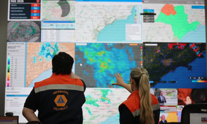 De acordo com a Defesa Civil de SP, nesta segunda-feira foi instalado um gabinete de crise para monitorar e responder aos impactos das chuvas intensas que atingem o litoral paulista, com o alerta de temporais prorrogado para toda a região ao longo do dia. A medida visa coordenar ações de emergência, vistorias preventivas e orientações à população das áreas vulneráveis.