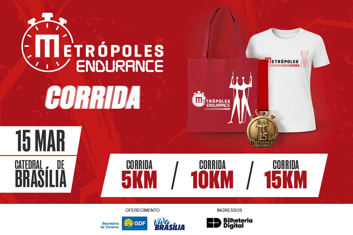 Brasília irá sediar o Metrópoles Endurance — Corrida, no dia 15 de março, com percursos de 5 km, 10 km e 15 km. O kit do atleta será entregue na véspera da prova e incluirá ecobag, camisa e medalha personalizadas. Apenas os atletas que completarem a prova receberão a medalha.