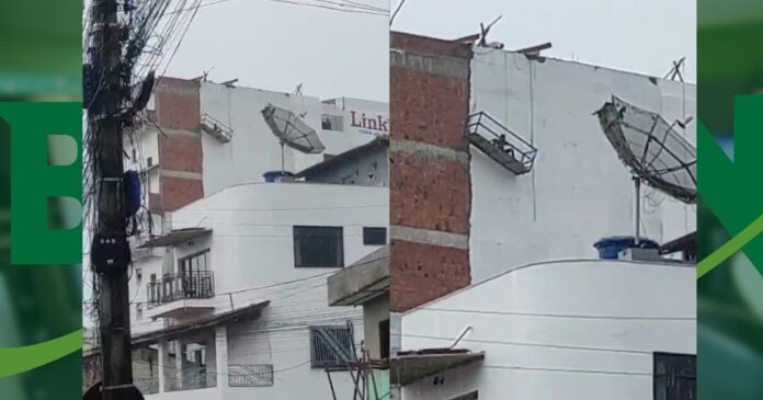 Imagens registradas por moradores do bairro mostram o instante da instabilidade da estrutura do andaime. O vídeo traz o momento em que o equipamento começa a ceder e o trabalhador fica em posição de perigo.