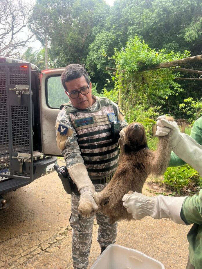A Guarda Civil Municipal de Salvador (GCM) realizou, neste sábado (28), o resgate de um bicho-preguiça-de-coleira encontrado em frente ao prédio da Escola de Medicina Veterinária (EMVZ) da Universidade Federal da Bahia (UFBA), em Ondina.
