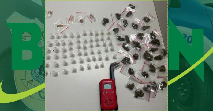 Durante a abordagem, o suspeito foi interceptado e detido. Na busca no local, foram apreendidos 63 pedras de crack, 35 porções de maconha e um rádio comunicador.