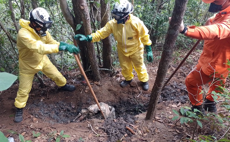 Localização dos corpos: com o avanço das diligências, equipes da Polícia Civil, 89ª CIPM, DPT e Corpo de Bombeiros localizaram as ossadas em área de difícil acesso. Peritos criminais e bombeiros entenderam que as vítimas foram executadas no próprio local.