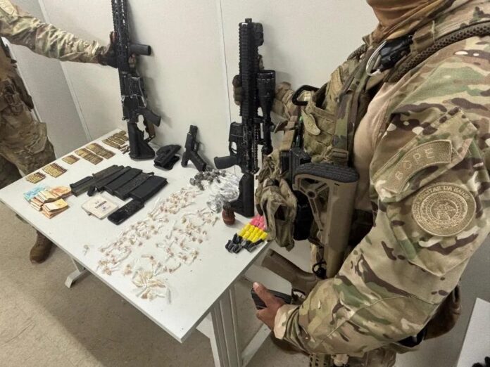 Na varredura, as forças de segurança apreenderam armas, munições, drogas, dinheiro em espécie e um artefato explosivo semelhante a uma granada. Entre os itens estavam uma pistola Glock 9mm com numeração suprimida, um fuzil 7.62 e uma carabina Colt M4 5.56, além de carregadores, porções de drogas e cerca de R$ 2,2 mil.