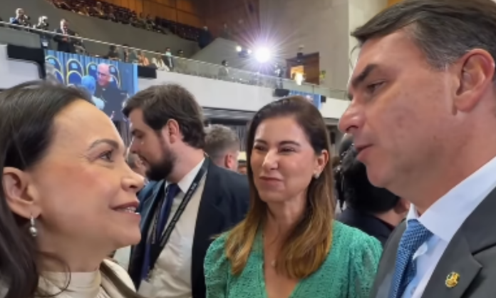 Corina Machado, líder opositora venezuelana e vencedora do Prêmio Nobel da Paz de 2025, reuniu-se com o senador Flávio Bolsonaro (PL) nos bastidores da posse do novo presidente do Chile, José Antonio Kast, em Valparaíso. Durante o encontro, a Nobel da Paz destacou a expectativa de cooperação entre Brasil e Chile pela justiça e pela democracia em nossos países.