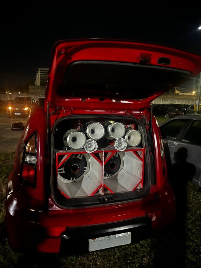 Em outro momento, após acionamento de um morador, os policiais seguiram para a Avenida Lauro de Freitas, nas proximidades da feirinha do Parque Verde, para averiguar denúncia de perturbação do sossego público. No local, dois veículos equipados com aparelhos de som automotivo do tipo paredão, acoplados a reboques, estavam em funcionamento com volume excessivamente elevado, causando incômodo aos presentes.