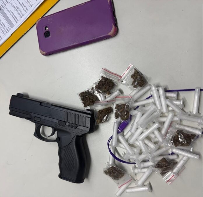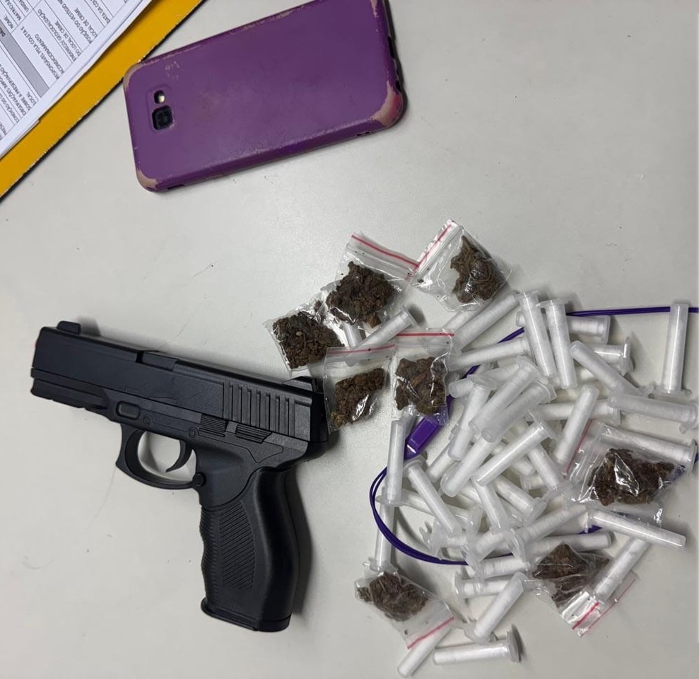 Durante a busca pessoal, os policiais encontraram um simulacro de arma de fogo, mais de 50 pinos de cocaína e oito porções de maconha, além de um aparelho celular.
